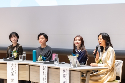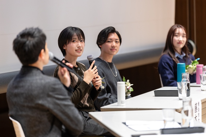 パネルディスカッションには、ユース世代として本学のほか神奈川大学とフェリス女学院大学からそれぞれ学生が登壇し、環境問題に対する活動内容の紹介や取り組むきっかけ、活動を広める工夫、GREEN×EXPO 2027への期待などについて話し合いました。