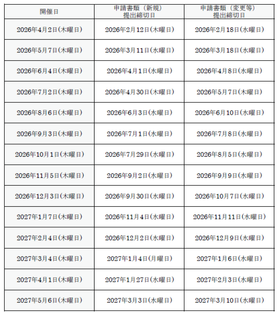 ※変更申請、定期報告、その他の審査書類の提出締切日は各新規申請書類提出締切日の概ね1週間後となります。