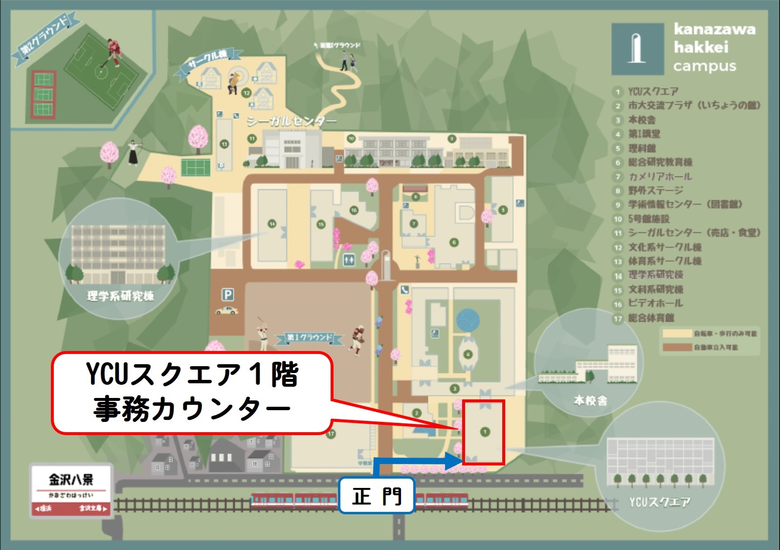 ご来室の際は、YCUスクエア1階の事務カウンターまでお越しください。