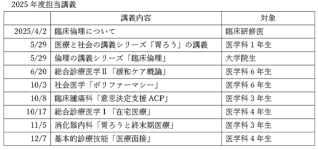 ● 在宅医療、臨床倫理、緩和ケア、ポリファーマシー等についての講義(下表)