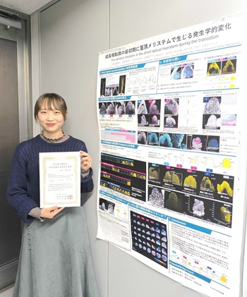 理学部理学科4年の本多 萌恵さんが、2025年9月10日に札幌市で開催された日本育種学会第148回講演会において、「成長相転換の最初期にイネの茎頂メリステムで生じる発生学的変化」について発表し、優秀発表賞を受賞しました。