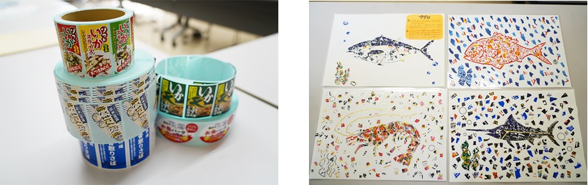 左:量販店で販売される魚パックに貼られる販売促進シールの余剰 右:廃棄シールをちぎって作成したおさかなアート(学生見本)