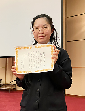 理学部理学科 3年(受賞当時)の和田久美さんが、2026年3月6日(金)~7日(土)に大分市コンパルホール・3階多目的ホールで開催された第11回デザイン生命工学研究会において「物理刺激によるスフェロイド内部壊死の抑制」について発表し、優秀ポスター賞を受賞しました。