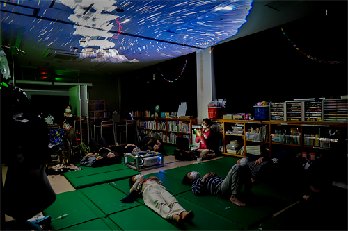星空を一通り眺めた後は、みんなでロケットに乗って星空のさらに向こう側にある宇宙へと出発をします。私たちの住んでいる青い地球を通り過ぎ、他の惑星や銀河系へも出かけました。子どもたちは普段は見ることができない他の惑星や銀河系の星を見ながら「あれは何だろう?」「地球って小さかったのか」「火星人はいるのかな?」と話していました。