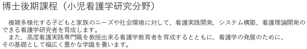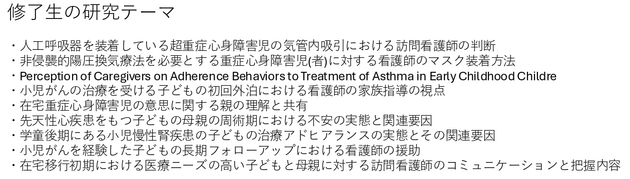 子どもとその家族の健康課題およびケアに関する研究 病気や障がいをもつ子どもの発達支援・在宅支援に関する研究 重症心身障害児のコミュニケーション支援開発に関する研究 |