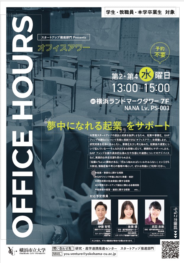 大学発スタートアップの創出および成長を一層推進するため、起業や事業化、GAPファンド申請等の幅広い個別相談の機会として「オフィスアワー」を開設しました。