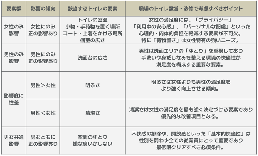 ・この「トイレの満足度 → 仕事の満足度」の影響度は、男女で統計的に差がなく、トイレに対する満足感が形成されれば、性別によらずその後の仕事への好影響を与えることがわかった。