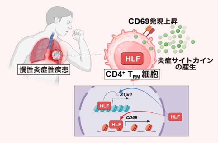 本研究では、転写因子HLFが、炎症反応を担う免疫細胞である炎症性CD4+TRM細胞を特定の組織に定着させる司令塔として機能することを初めて解明しました。