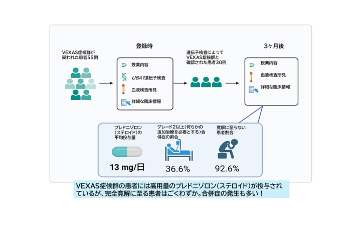VEXAS症候群は、UBA1遺伝子の後天的変異により生じる重篤な自己炎症性疾患で、主として高齢男性に発症します。皮膚、軟骨、肺、関節、血液系など多臓器に炎症を来し、感染症や血液疾患を合併しやすいことが知られています。これまで後ろ向き研究*4から重症例の存在は示されていましたが、どの患者さんが不良転帰をたどるのかを前向きに評価した研究は限られており、信頼できる予後予測因子の確立が求められていました。