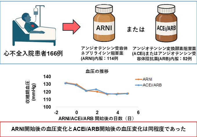 ARNIは2020年から使用可能になった新しい心不全治療薬で、いままで使用されていたACEi/ARBよりも有効性が高い薬剤ですが、血圧を低下させる作用が強く、血圧の下がりすぎが懸念されていました。しかし、欧米では心不全の入院期間は日本よりも短く、入院中の詳細な血圧の変化はわかっていませんでした。