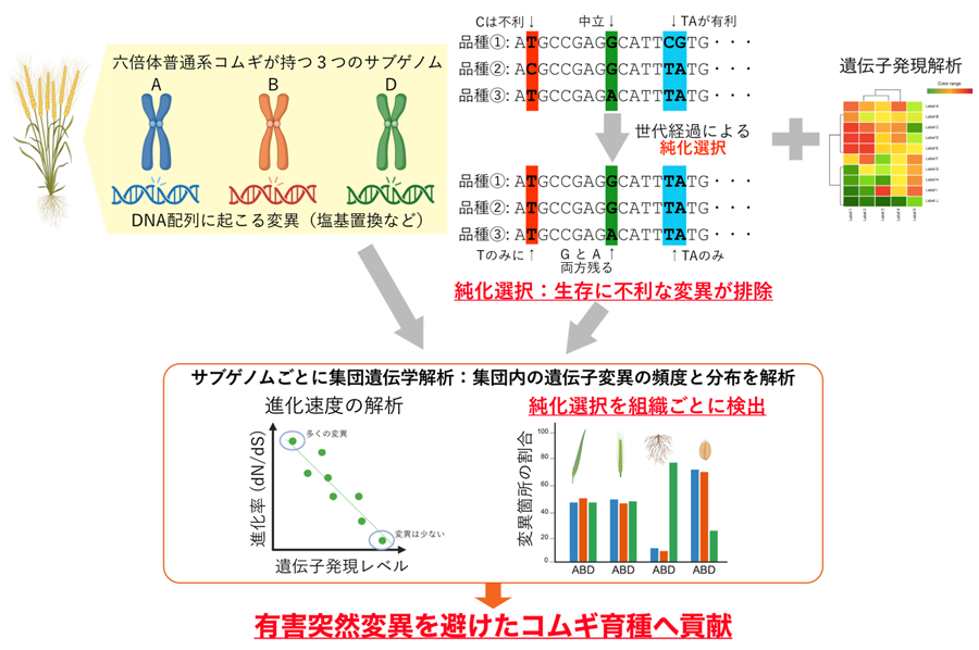 気候変動による作物栽培への影響がますます深刻になり、人口も増加し続け、国際情勢も刻々と変化する中、世界の食糧安定供給のためには、高温・乾燥などの環境ストレスや病害への抵抗性を備え、かつ収量が高いコムギ品種の育成が急務です。特に近年は、コムギのゲノム配列、トランスクリプトーム(大規模遺伝子発現)データの整備が急速に進んでおり、これらの基盤情報を根拠として交配育種に利用する品種・系統を選抜するゲノム育種が重要となってきます。本研究で得られたゲノム全体の有害突然変異や純化選択の情報は、有害突然変異を除きながらより効率的に有用形質を持つ品種を育成するための重要なデータセットといえます(図2)。本研究で行った結果は、モデル倍数体植物のミヤマハタザオの解析結果と共通しており、倍数体植物に普遍的なパターンとして、コムギだけでなくセイヨウアブラナやワタなど他の倍数体種のゲノム育種による新品種育成への展開が期待されます。本研究は、倍数体作物における有害変異の影響を理解し、より精密なゲノム育種を実現するうえで重要な基盤となります。