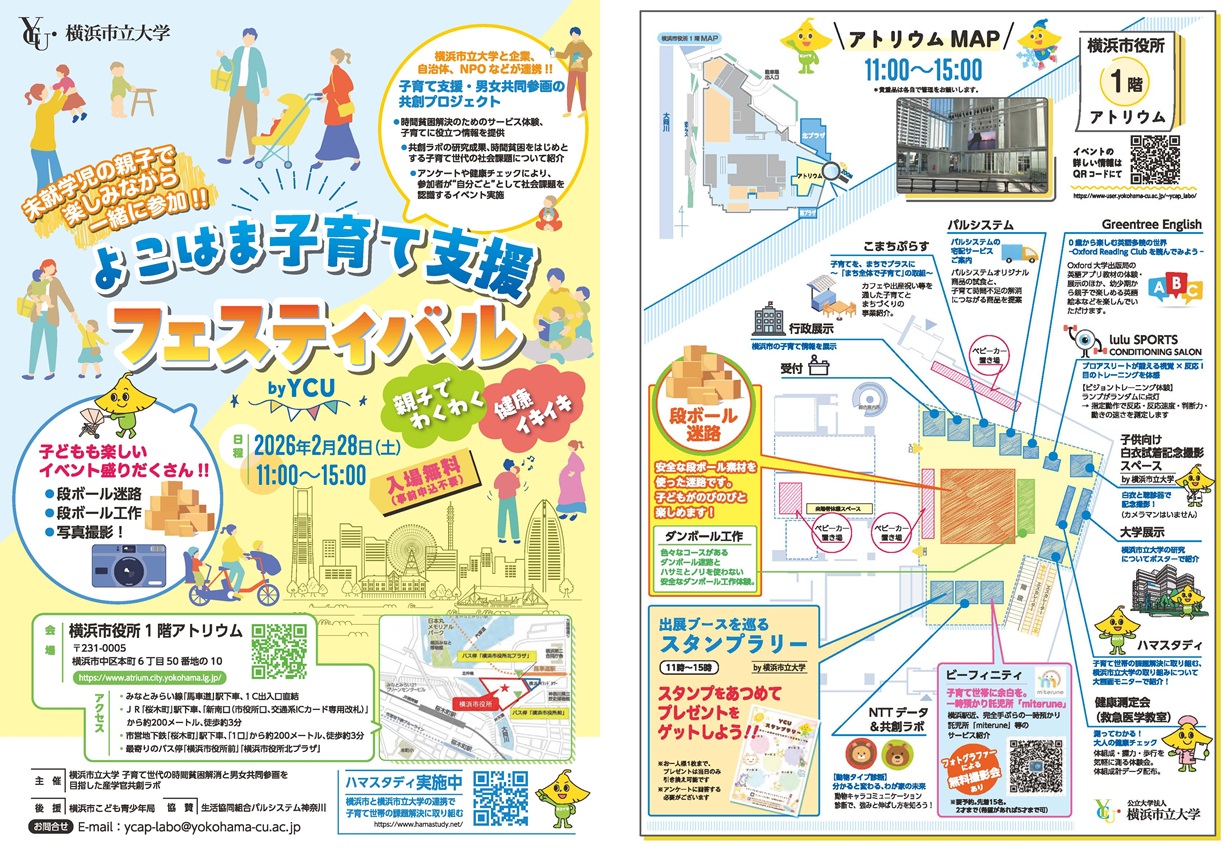 このたび、医学部看護学科老年看護学領域 叶谷由佳教授がリーダーとなり、第8回目の産学官共創会議(Y-CAPミーティング)として、市民の皆様にご参加いただけるイベント「よこはま子育て支援フェスティバル」を開催します。