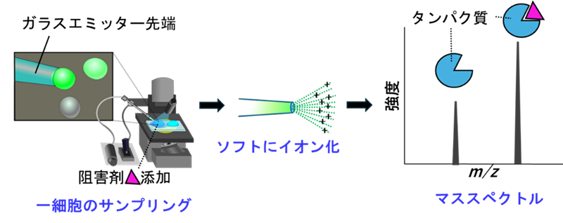 本研究では、薬剤標的となるタンパク質を過剰発現させたヒト培養細胞(HEK293T細胞)にタンパク質の阻害剤を浸透させたのち、そのまま1つの細胞を質量分析用のガラスエミッターにサンプリングしネイティブ質量分析することに挑みました。そして、細胞内での阻害剤との複合体の形成をネイティブ質量分析で確認することを目指しました。機能しているタンパク質の質量を細胞ごとに求められれば、数多くの細胞の平均的な状態でなく、さまざまな状態の細胞を1つずつ把握でき、生命科学研究を進める上で大きく貢献します。