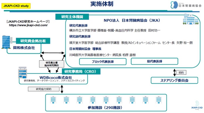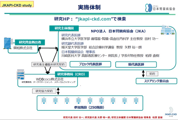 本試験は、興和株式会社の資金提供を受けて、NPO法人日本腎臓病協会(理事長:柏原直樹〔川崎医科大学高齢者医療センター 病院長〕)、研究事務局のWDBココ株式会社を含む3者間での研究者主導臨床研究契約 (産学連携契約)締結のもと実施されています。横浜市立大学附属病院、同学附属市民総合医療センターを含む全国約290の医療機関が参加しており、研究代表を本学の田村功一主任教授、研究副代表を順天堂大学医学部 総合診療科学講座/AIインキュベーションファームの矢野裕一朗教授/センター長が務めています。
