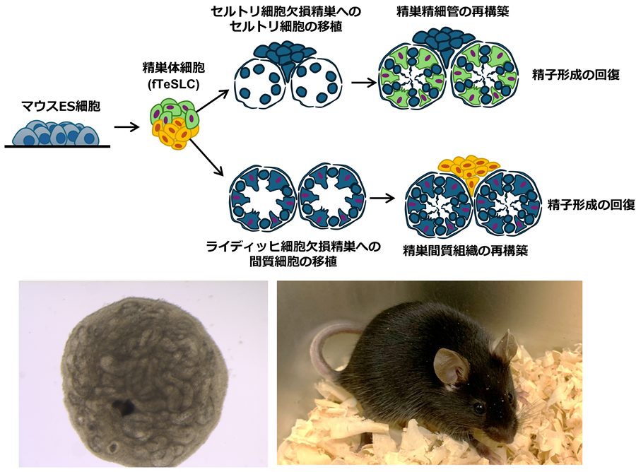 マウス多能性幹細胞(ES細胞)から、精巣を構成する主要な体細胞(セルトリ細胞・ライディッヒ前駆細胞)を誘導。これを体細胞欠損モデルマウスへ移植することで、精子形成を支える組織構造(精細管*3(左下写真)・間質*4)の再構築に成功した。その結果、停止していた精子形成が再開し、得られた精子細胞を用いた顕微授精により、健康な産子を獲得した(右下写真)。