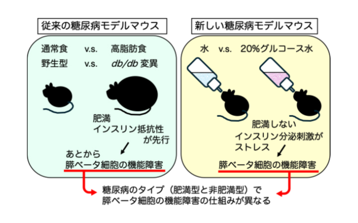 (右)本研究で開発した非肥満型の糖尿病モデルマウス。20%グルコースを含む水を2週にわたって飲ませ続けると、インスリン分泌が過剰に刺激されることがストレスとなって、膵ベータ細胞の機能障害が起きる。このマウスは肥満せず、膵ベータ細胞の機能障害の仕組みも従来のモデルとは異なることを明らかにした。