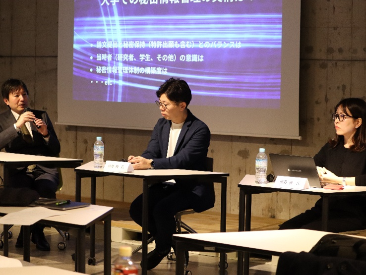 パネルディスカッションでは、「大学での秘密情報管理の実情」「大学発スタートアップ創業前に望まれる知財活動」「大学発の技術・知財を実用化するにあたっての課題」の3つのサブテーマを軸に、研究者(スタートアップ創業予定者)、知財専門家、スタートアップ創出支援者がそれぞれの立場から大学発スタートアップ特有の論点について活発に議論を交わしました。