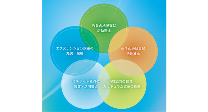 - 能動的な学習プログラムであるアクティブラーニングや、地域内の企業・NPO等へのインターンシップ科目を拡充した「地域実践プログラム」を創設し全学的に展開