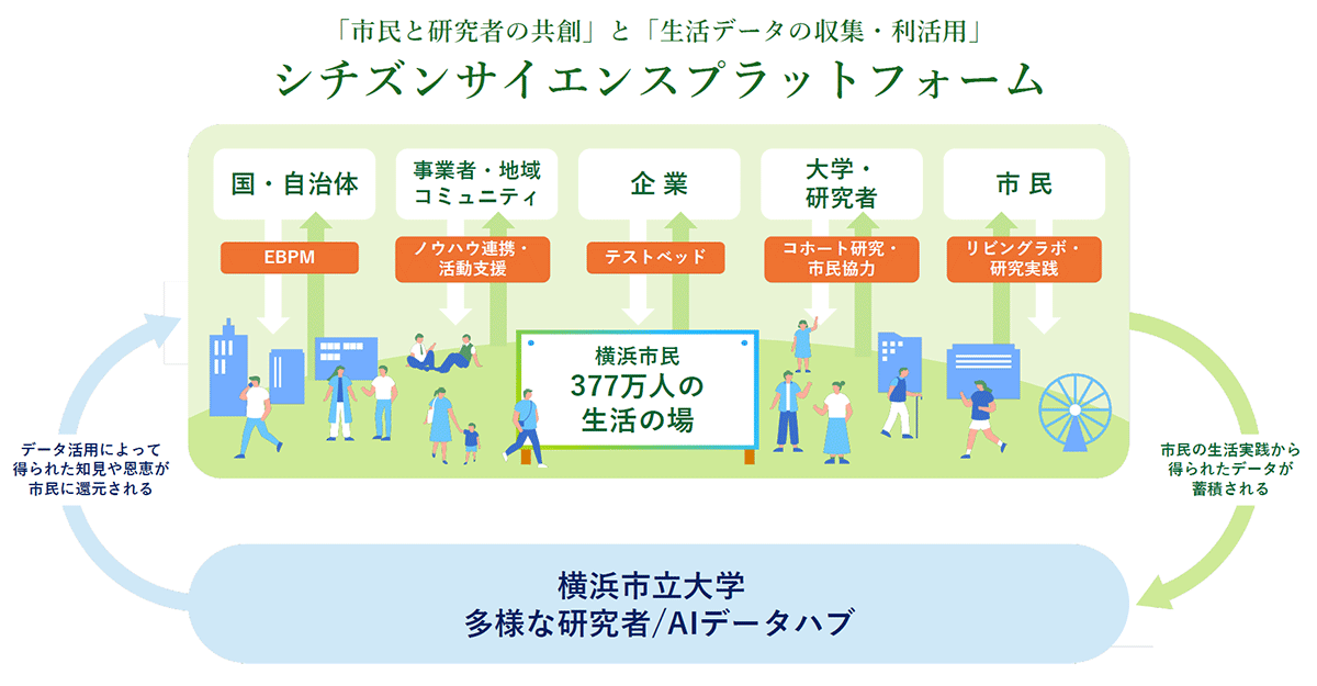 本事業の中心となる「よこはまデータサイクル」は、大都市横浜が持つ多彩なフィールドデータ(医療や市民生活データ)を活用し、本学と社会の多様なステークホルダーが一体となってより良い未来社会を実現していく循環を意味しています。
