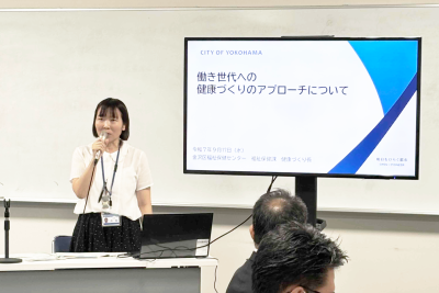 今回は“金沢区のウェルビーイングってなんだろう?”をテーマに開催しました。まず、金沢区役所区政推進課より「ウェルビーイングに関する区の取り組みと課題」について紹介いただいたのち、事例紹介として、金沢区役所福祉保健課健康づくり係より「働き世代への健康づくりのアプローチ」について、続いて横浜市大国際教養学部 鈴木伸治 教授から「ウェルビーイング向上に寄与するまちづくり計画支援ツール」についてご紹介いただきました。