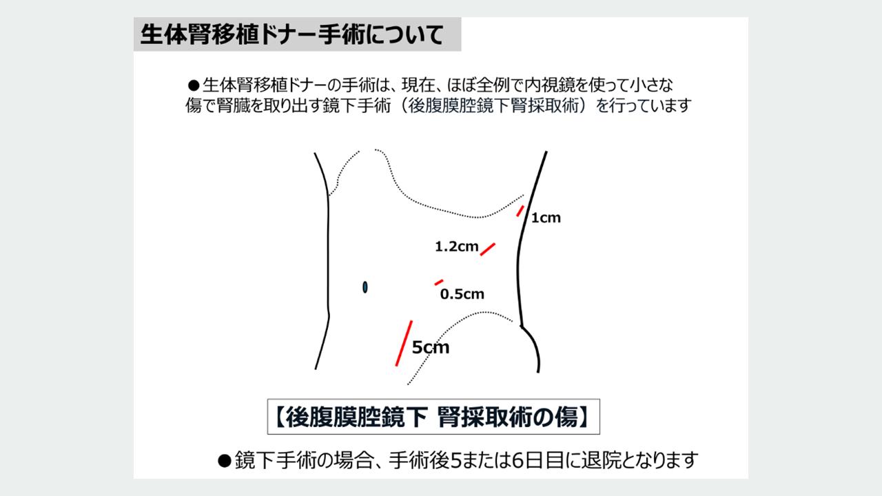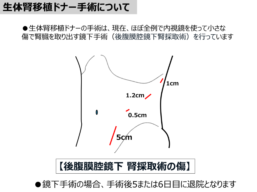 腎移植当日は、まずドナーの手術を先行し、腹腔鏡下(正確には後腹膜腔鏡下)に5㎝ほどの下腹部の小さな傷からドナーの片側の腎臓を採取します。