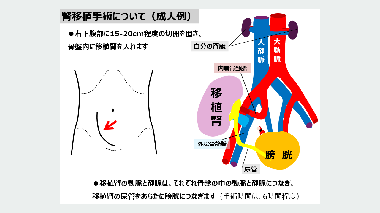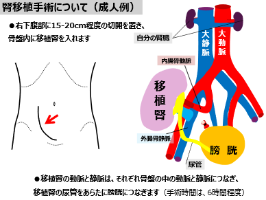 採取された腎臓を、一般的には右の下腹部に15から20㎝の切開をおき骨盤内に移植します。