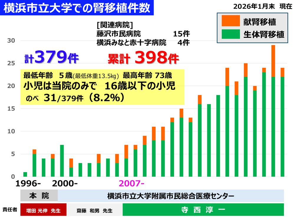 横浜市立大学では、1996年から福浦(本院)で腎移植を開始、その後2000年の開業から当院に移管、2007年からは私が腎移植の担当責任者となり、2026年1月末までに生体腎移植と献腎移植を合わせて379例の腎移植(年齢は5歳から73歳まで)を、地域医療として行ってまいりました。