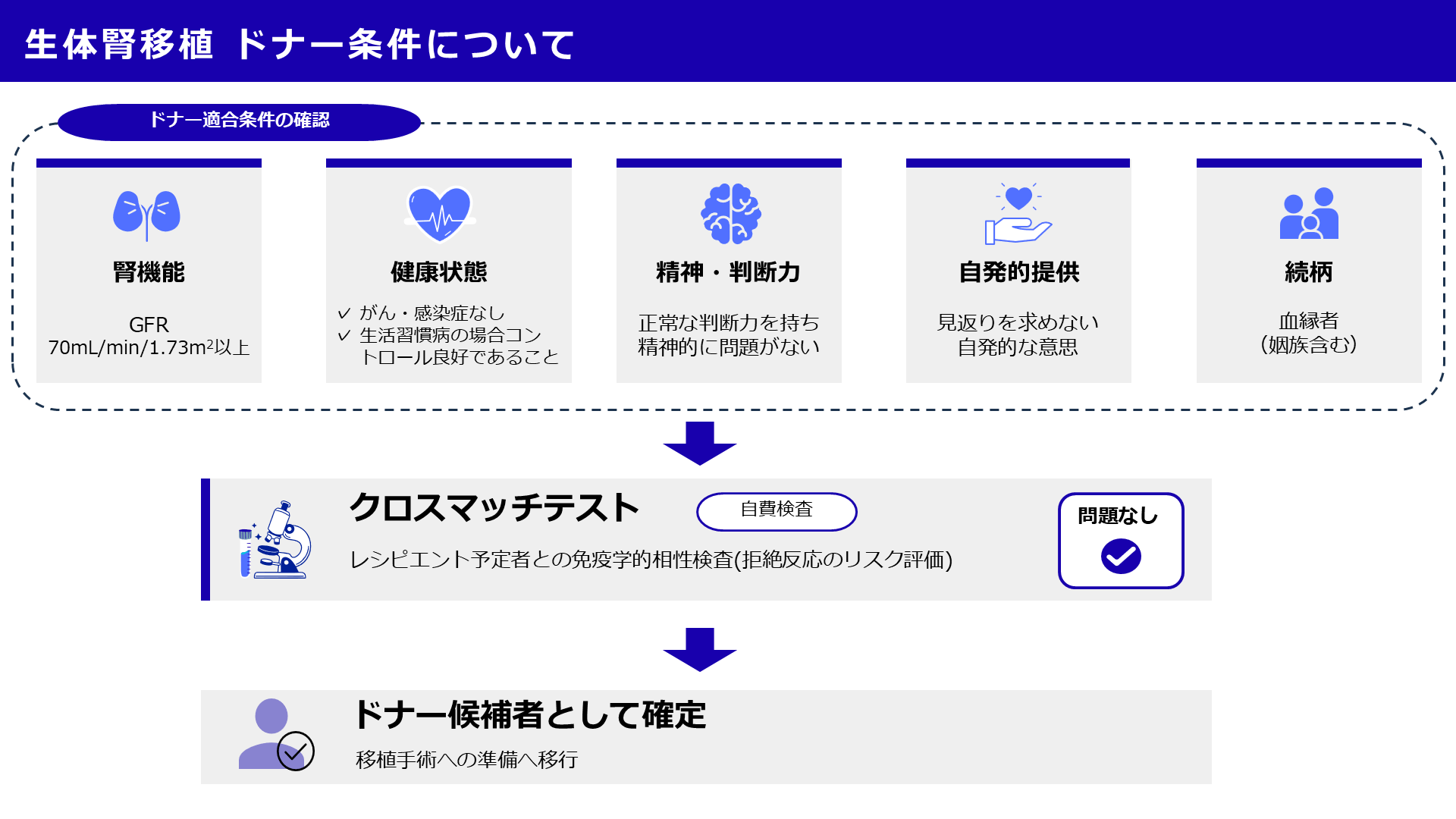 これらの基準を満たした上で、腎移植レシピエント予定者とのクロスマッチテスト(免疫学的な相性をみる自費検査)を行い問題なければドナー候補者として確定となります。