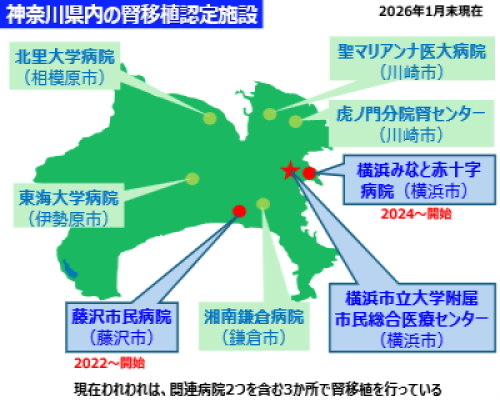 腎移植手術は認定施設のみで施行可能であり、現在、神奈川県内には8施設あり、そのうち横浜市内には当院を含めた2施設しかありません。