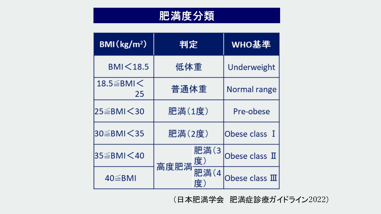 肥満の判定に関しては、本邦の基準とWHO(World Health Organization)基準では異なる点があり、本邦では25≦BMIの際に肥満と判定しますが、WHO基準では25≦BMI<30を過体重、30≦BMIの際に肥満と判定します。
