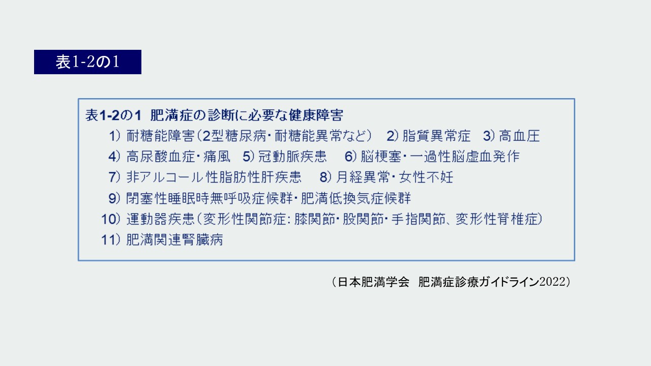 肥満に起因ないし関連する健康障害(表1-2-1)を合併するか、その合併が予測され、医学的に減量を必要とする疾患。