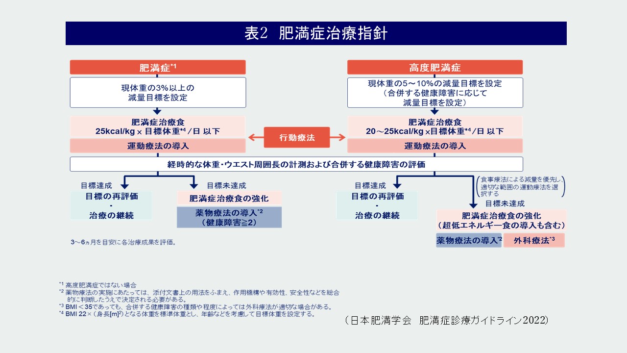 その後に定期的に体重や健康障害の有無を評価した上で、目標を達成できない際には薬物療法、外科療法の導入を検討します。