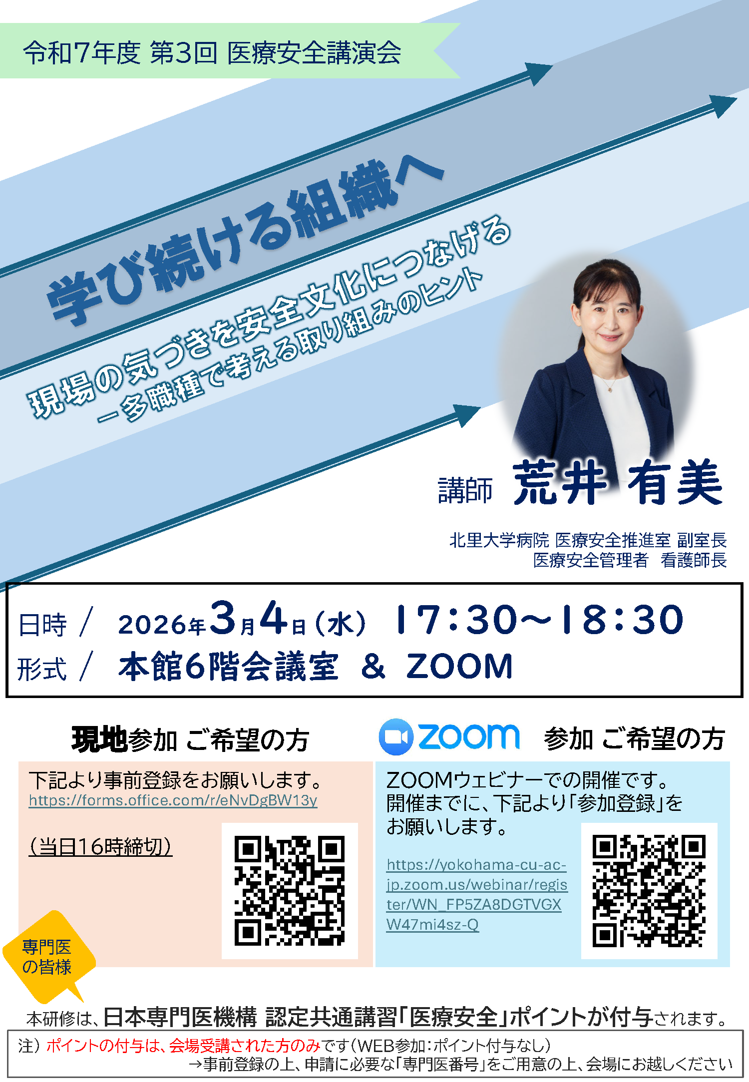 なお、本研修は、日本専門医機構認定共通講習「医療安全」ポイントが付与されます。(現地参加が条件となります。)